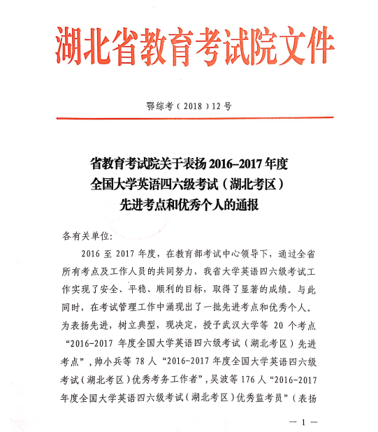 本网讯(通讯员 胡冰儿)近日,湖北省教育考试院举行2016-2017年度全国大学英语四六级考试(湖北考区)先进考点表彰大会,并正式发文公布了《省教育考试院关于表扬2016-2017年度全国大学英语四六级考试(湖北考区)先进考点和优秀个人的通报)》(鄂综考〔2018〕12号),以表彰在2016-2017年度我省大学英语四六级考试工作中有优异表现的考点。在此次表彰中我院被评为“2016-2017年度大学英语四六级考试(湖北考区)先进考点”。